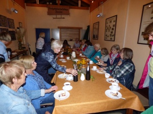 Zum Start bei Bonordens gab es unter der großen Kastanie mitten im Hof einen kleinen Eierlikör – denn, so war zu hören: „Was wären die LandFrauen ohne Eierlikör!“ Die Erntekrone wurde besichtigt und die Hofchefin wusste manches aus dem Ort und dessen Historie zu berichten. Beim nächsten appetitlichen Stop versorgte LandFrau Irmtraut Bredemeier, Inhaberin von Bredemeiers Bauernlädchen, die Wandergruppe mit köstlichem Quark, den außer einem Erdbeertopping auch ein Mützchen aus Eierlikör krönte. Weiterhin kredenzte Virginiias Mann Wein von Steinberger Reben, bevor es zum abschließenden Kaffeetrinken in die Altes Schule Borstel ging.