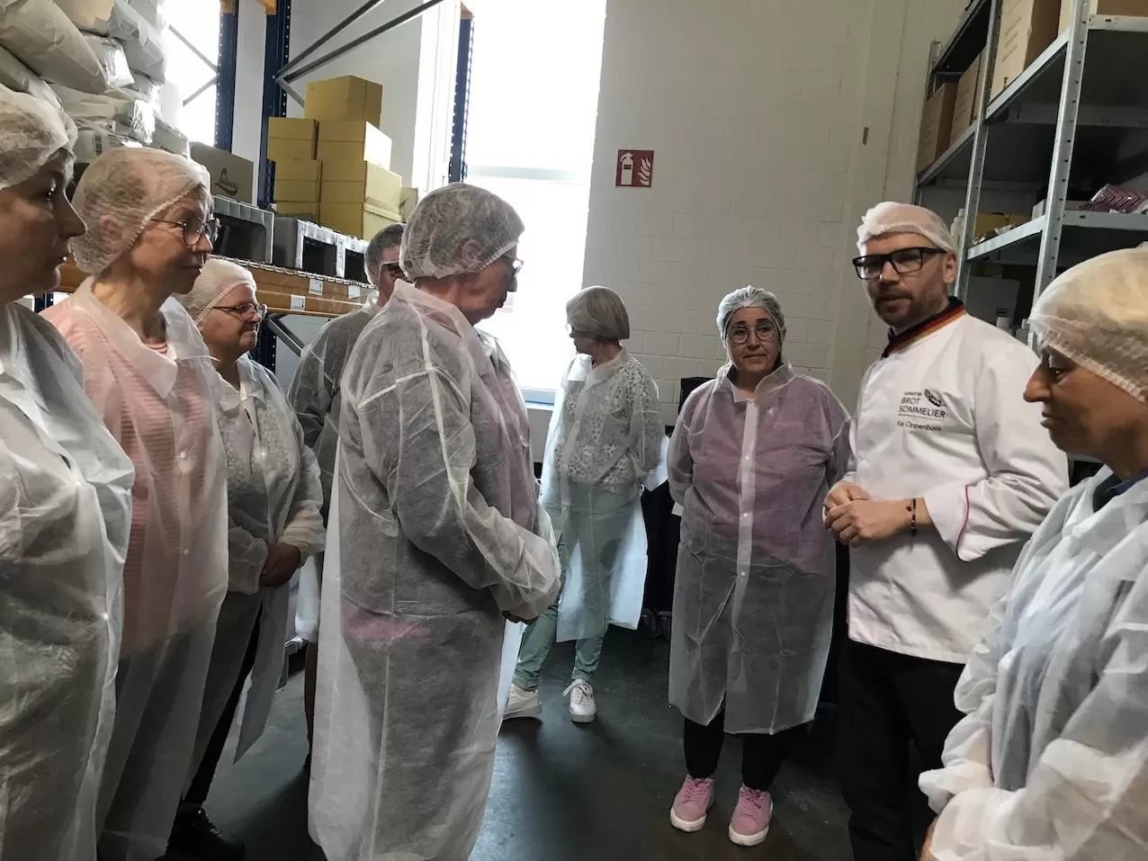Die abfallende Wärme werde im Betrieb genutzt, damit spare man um die 20% an Energie ein. Vorbei gingen die LandFrauen auch an der Spülmaschine, wo die Lieferkörbe für die Filialen gewaschen werden – je Spülgang nur drei Minuten bei 80 Grad mit hohem Wasserdruck. Zum Ende der Führung ging es in den Konditorbereich. Dort wurden Bleche für Kuchen mit Teig bestückt und eine bestellte Torte mit Deko und handgeschriebenem Marzipandeckel verziert. Ein Schokobrunnen für Gebäck beeindruckte alle, er läuft den ganzen Tag. Da hätten die Damen schon mal gerne genascht. Nachdem die Schutzkleidung abgelegt wurde, konnten sich aber alle mit Kaffee, Brötchen, Marmelade und Deftigem den inzwischen eingestellten Hunger stillen. Auch dieser Ausflug begeisterte die LandFrauen. In Fahrgemeinschaften ging es dann wieder Richtung Heimat.