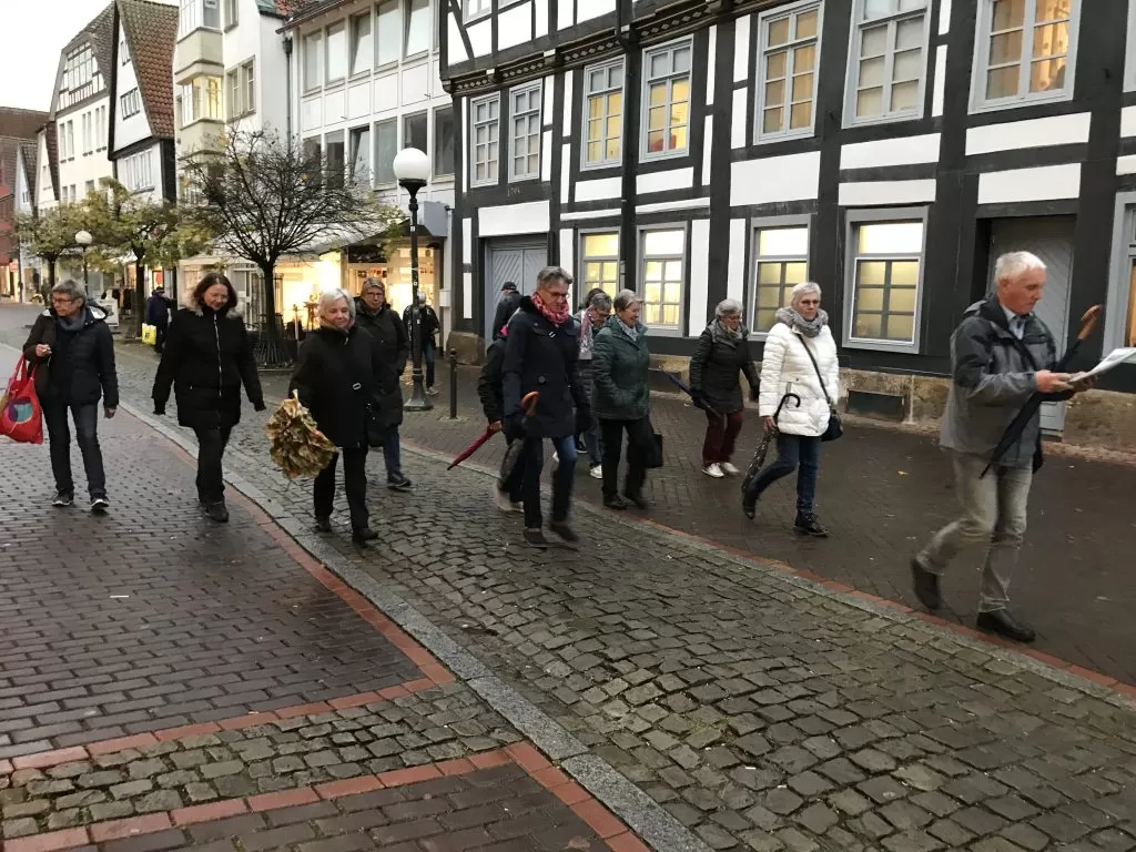 130 Jahre lang tobte in Stadthagen der Hexenwahn. Zwischen 1560 und 1690 konnte jede Frau als Hexe denunziert und von einer willfährigen Obrigkeit gnadenlos verfolgt werden. Und fast immer endete das für die Frau mit ihrem Tod. Darüber hatte der Gästeführer Herr Stüber sehr viel zu berichten. Aufgrund der Wetterlage begann die Führung in der St. Martini Kirche , dann ging es quer durch das Stadtzentrum. Die LandFrauen blieben an markanten Häusern stehen, zu denen Herr Stüber eine Geschichte über vermeintliche Hexen zu erzählen wusste. Im Bereich vor dem Niederntore stand früher ein Galgen, im Graben davor wurde die Wasserprobe durchgeführt. Der, mit den höchst interessanten und lebendige Ausführungen des Gästeführers verging wie im Fluge.