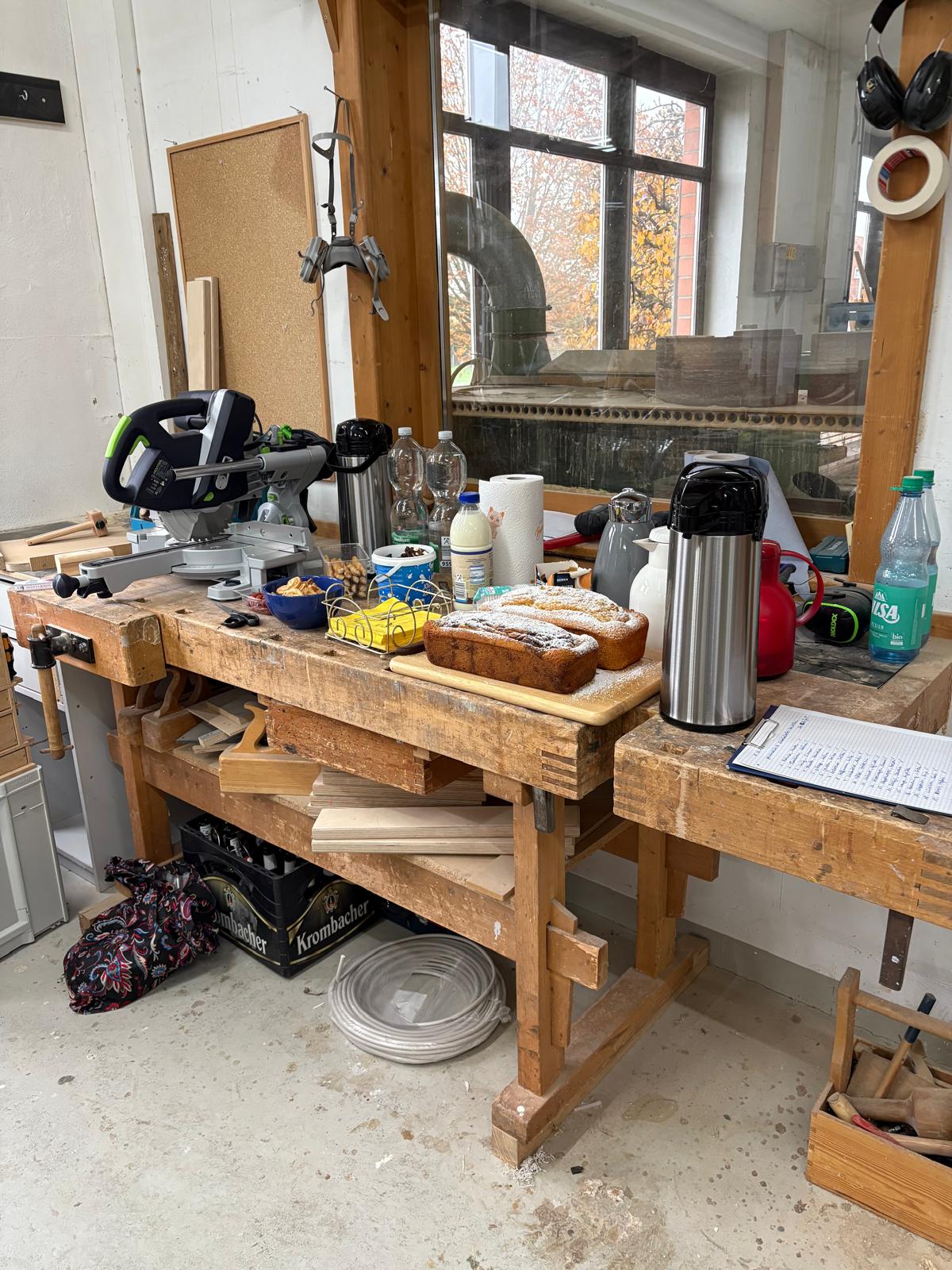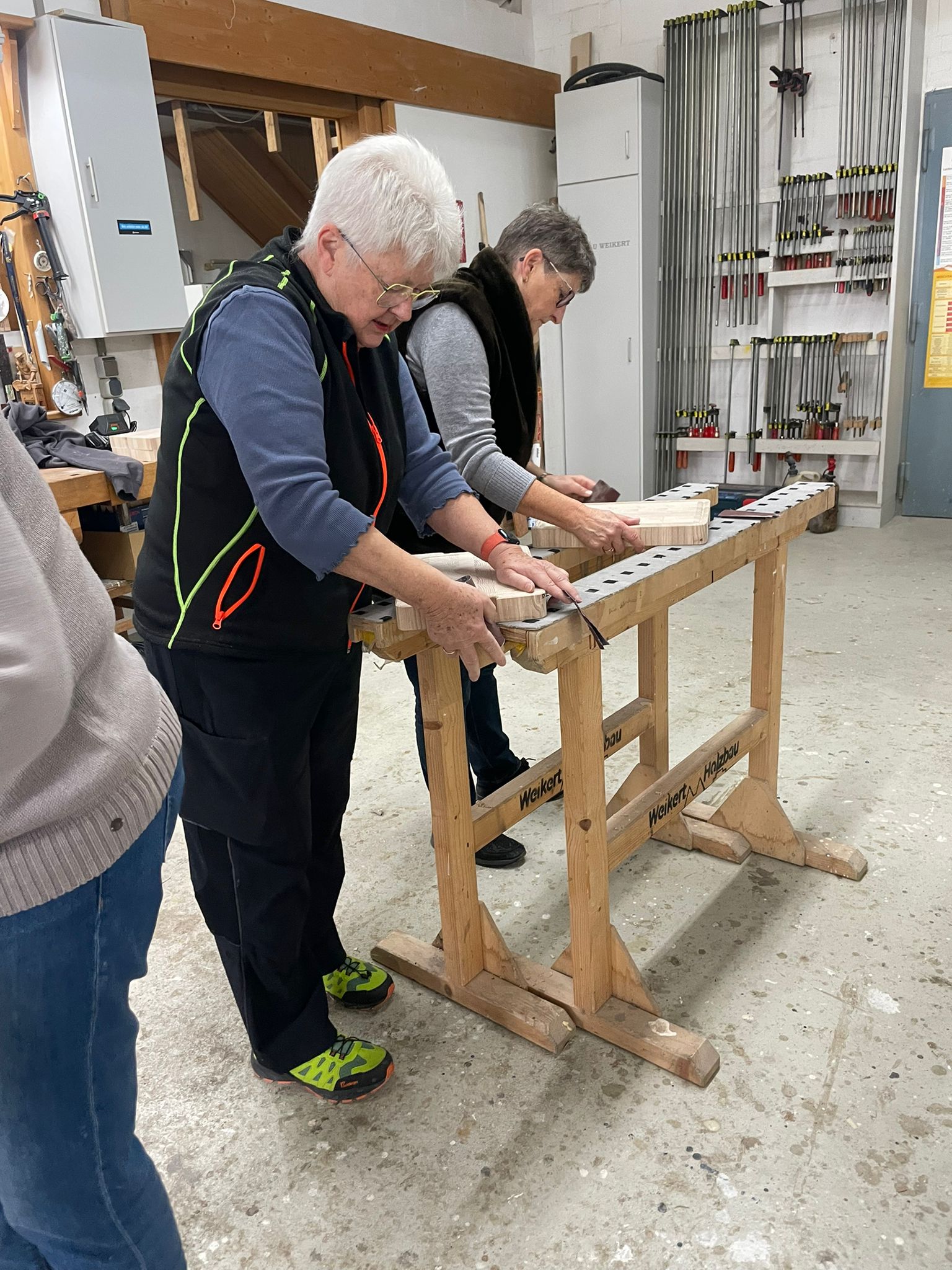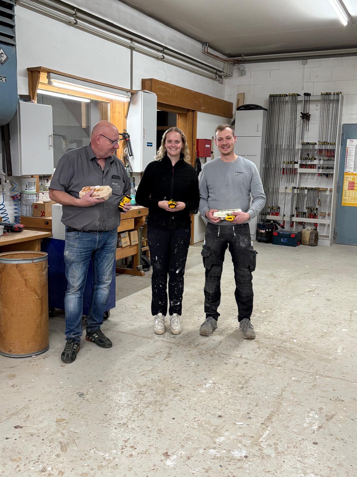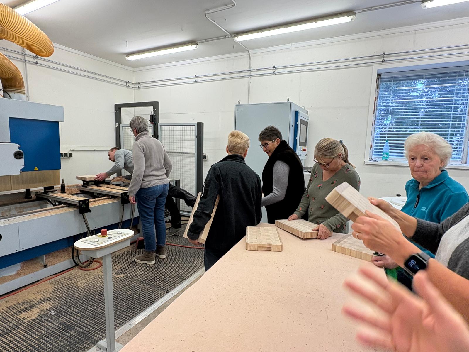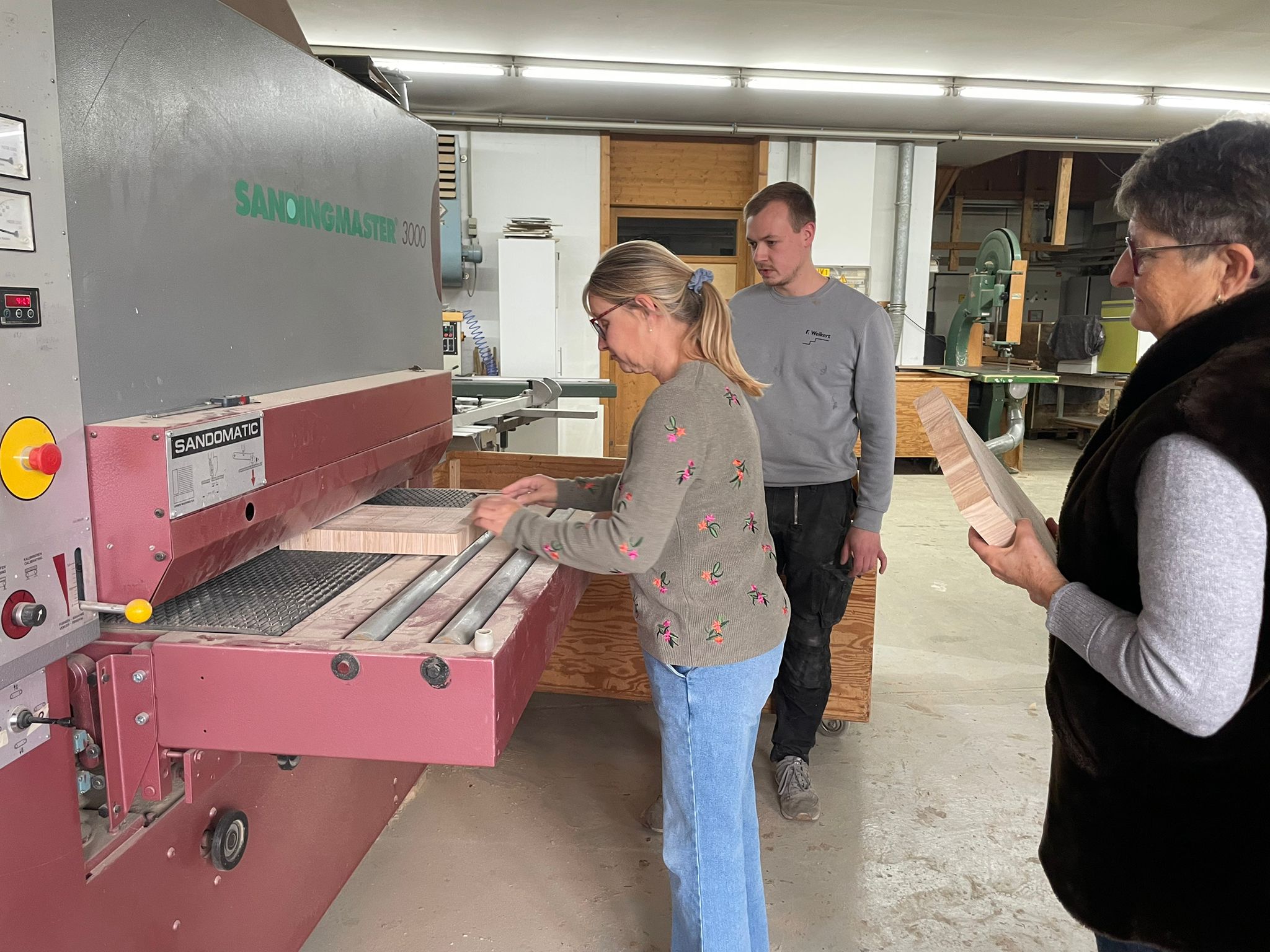 Nach einer interessanten Betriebsführung – vom Holzstamm zum fertigen Brett – ging es ans Werk: Schleifen, Fräsen, Saftrinne und Traggriffe einarbeiten und Kanten abrunden. Unter der fachkundigen Anleitung und Unterstützung der beiden Meister, Florian und Andreas Weikert, entstanden individuelle Unikate.