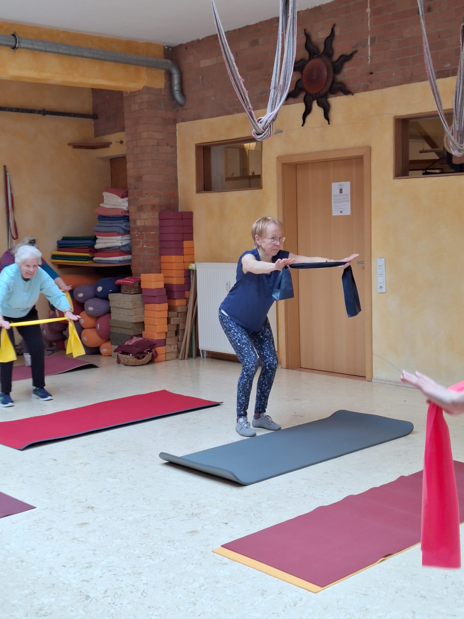 Nach einem lockeren Aufwärmen stärkten wir mit dem Theraband gezielt unsere Muskulatur. Jede hatte sich ein Theraband mit der für sich passenden Zugkraft ausgesucht.
