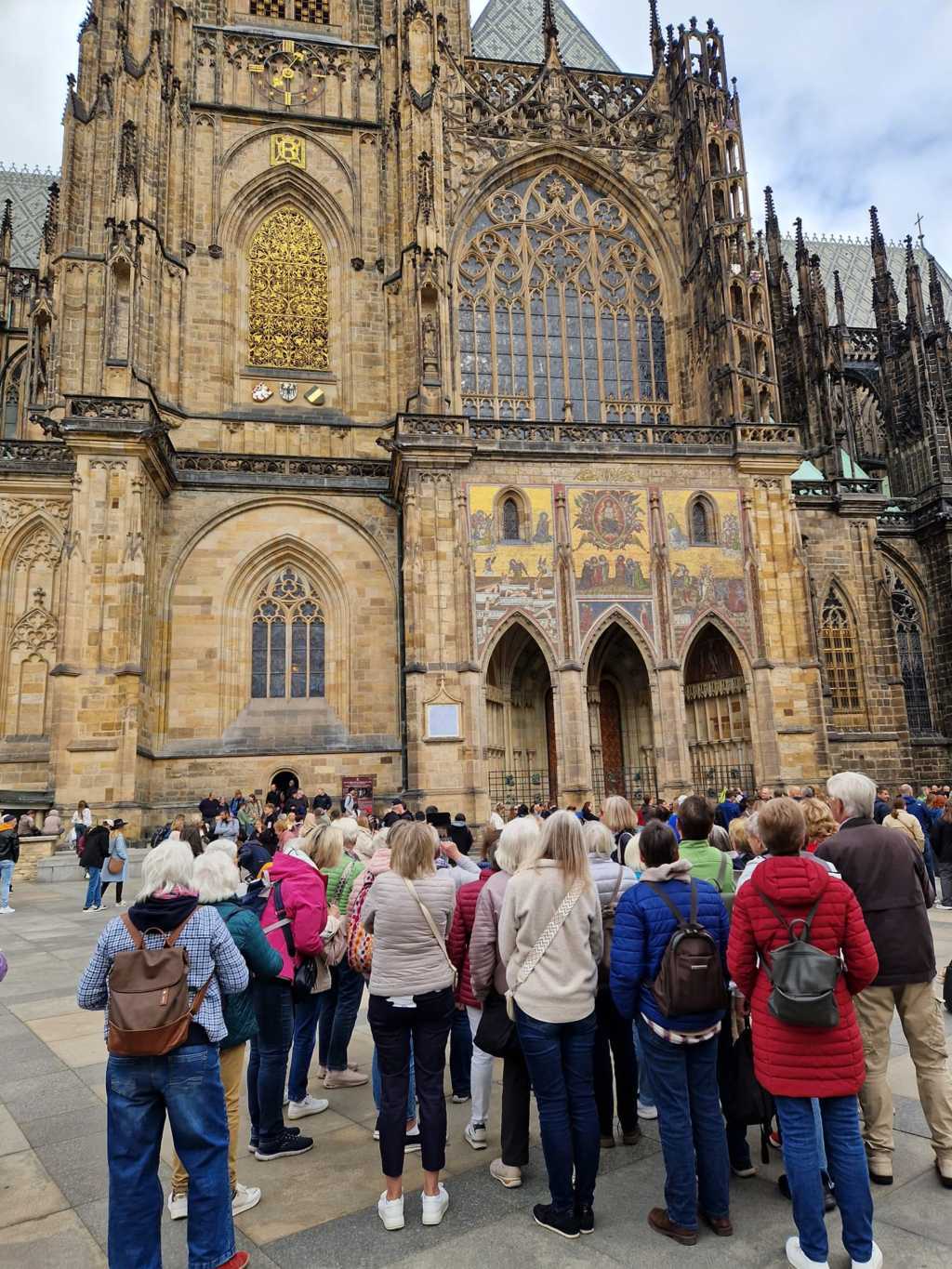 Am Samstag, den 27. September 2025, erwartete uns eine Führung auf der Prager Burg. Auf dem Areal der Hochburg befinden sich etliche eindrucksvolle Bauwerke und Sehenswürdigkeiten wie der St. Veitsdom, eine der wichtigsten Kathedralen der Stadt. Der böhmische und später der tschechische Staatsapparat ist auf der Burg ansässig. Von hier oben hat man einen prächtigen Panorama-Blick auf die Stadt Prag.